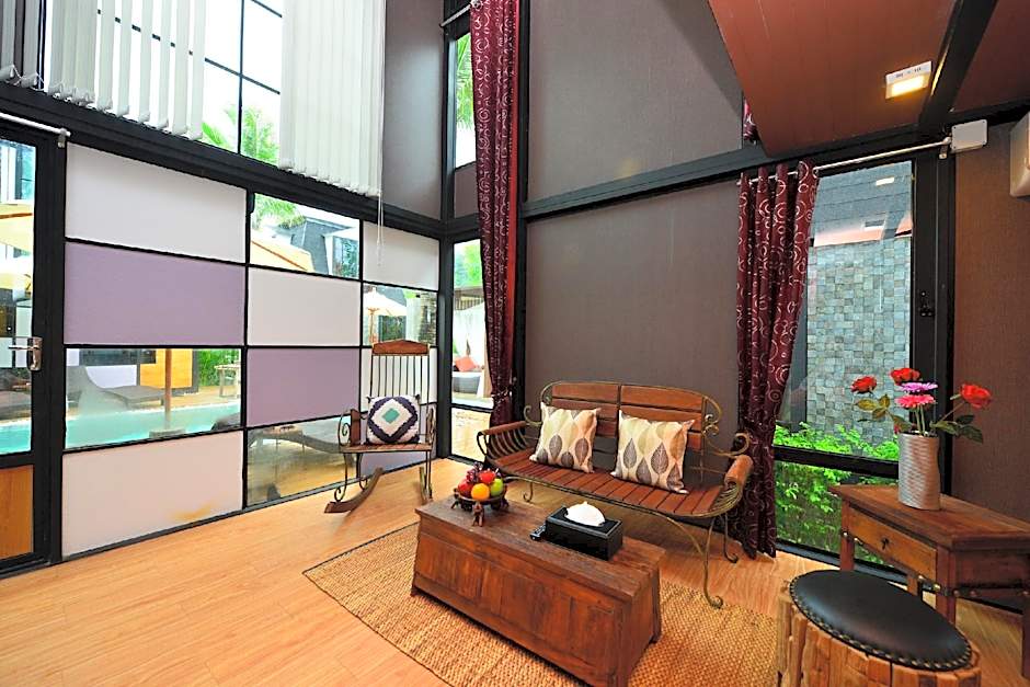 Villa Two Bedrooms With Private Pool is 3875 square feet and includes a king-size bed 150-183 width plus balcony, extra beds on demand, desk, and ironing set.